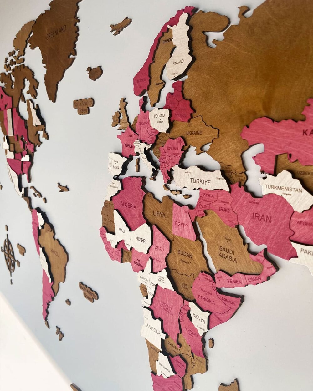 Wooden 3D World Map | PINKY is not only a wall decoration, it is also a unique way to express your passion for travel and add color to your life while creating an elegant accent to your interior.