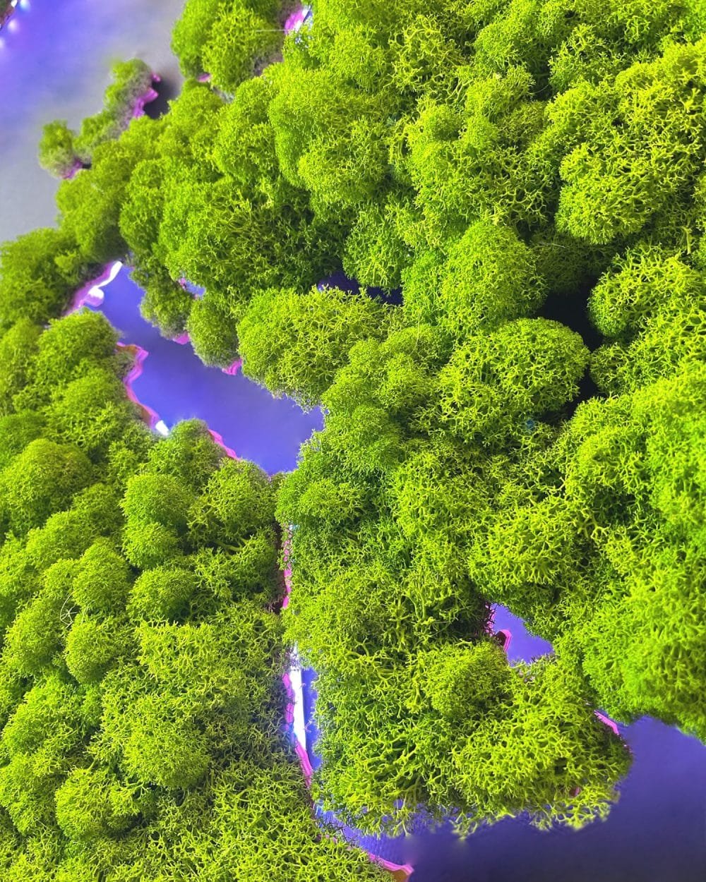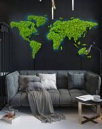 Moss used for LED illuminated world maps improves room acoustics, so you can listen to music without echoes. An additional advantage of our LED maps is that the colors can move to the rhythm of the music.