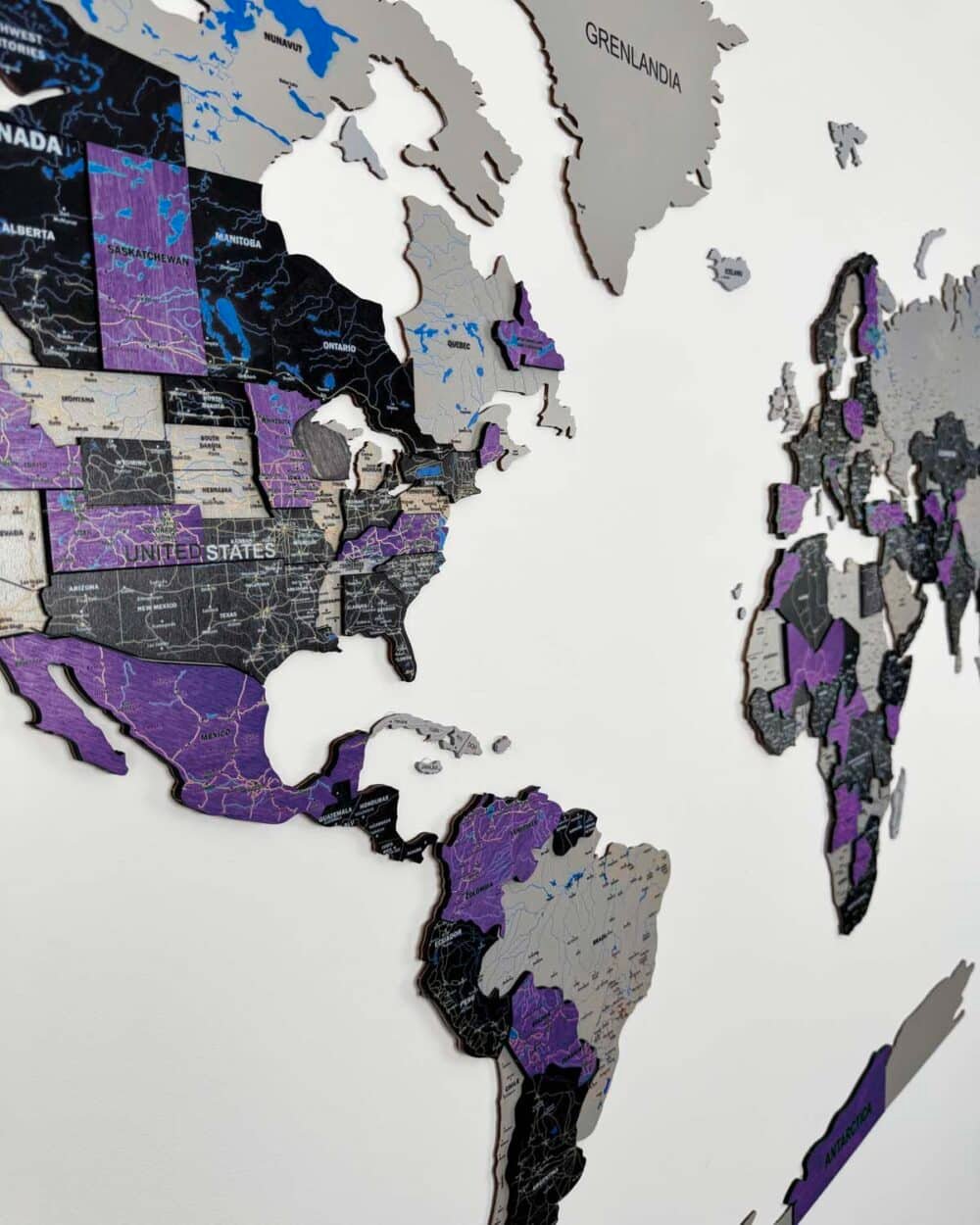 Premium 3D world map made of wood | INDIGO Birdywing® is an elegant and unique decoration that will enhance any interior. This handcrafted map on a gray base with green accents is not only eye-catching, but also educational, displaying national borders, names of states and major cities, as well as rivers, lakes and major roads. Thanks to its three-layer construction, the map creates a fascinating three-dimensional effect that adds depth and unique charm to the space.