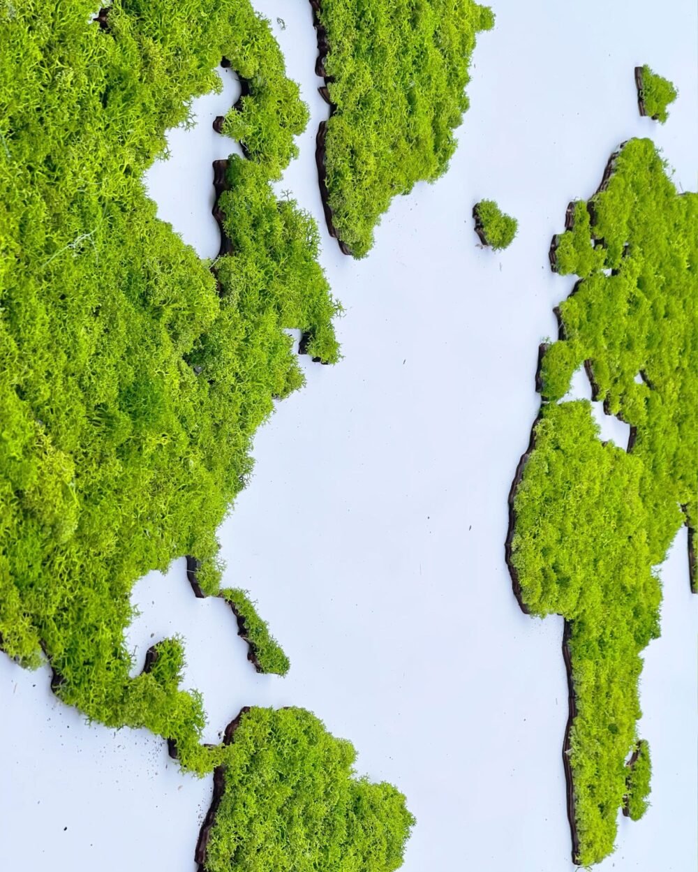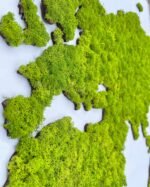 A moss wall decoration will give any interior a unique character, and will also make you feel calm and comfortable. After all, the colors of the earth, and especially green, help to maintain a calm state of mind. The Moss World Map is completely maintenance-free, requires no watering, fertilizing or pruning. It also does not require sunlight or lamps. Moss is a very durable plant in itself, because it does not need any contact with the soil. A minimum air humidity is enough for the moss to remain velvety soft and maintain a lush green color. The green moss map will retain its natural, green color and velvety pleasant to the touch, if the air humidity remains between 40-60%. This is the standard air humidity that is found in every home where people stay.